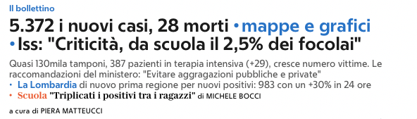 A questo punto, faccio un paio di conti, pur sapendo che se ne potrebbero fare di più approfonditi incrociando molti altri dati: in Italia la popolazione scolastica è di circa 8 milioni di studenti (qui la tabella con i dati ISTAT relativi al 2018), perciò gli studenti (esclusi gli universitari) costituiscono circa il 13% della popolazione italiana. Da questo 13% provengono il 2,5% dei focolai in Italia. Non mi sembra una notizia così cattiva, sia pure considerando che la scuola è cominciata da sole quattro settimane.